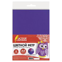 Цветной фетр МЯГКИЙ А4, 2 мм, 5 листов, 5 цветов, плотность 170 г/м2, оттенки фиолетового, ОСТРОВ СОКРОВИЩ, 660645