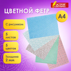 Цветной фетр МЯГКИЙ А4, 2 мм, 5 листов, 5 цветов, плотность 170 г/м2, пастель с рисунком, ОСТРОВ СОКРОВИЩ, 660650