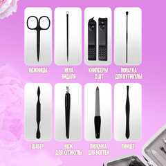 Состав набора: ножницы, игла Видаля, книпсеры (2 шт.), лопатка для кутикулы, шабер, нож для кутикулы, пилочка для ногтей, пинцет.