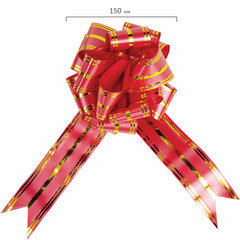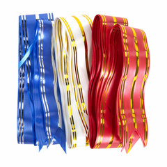 Бант-шар ЗОЛОТАЯ СКАЗКА - идеальный вариант для тех, кто считает, что каждый подарок должен быть уникальным и выделяться из массы других своей оригинальностью.Набор состоит из 3-х бантов-шаров в трех цветах с металлизированными полосами - красный c золотистыми полосами, синий с серебристыми полосами, белый с золотыми полосами. Ширина ленты - 5 см, длина ленты в разобранном виде - 157 см. Банты выполнены из прочного полипропилена (80%) и полиэтилена (20%). Диаметр банта в собранном виде около 15 см.