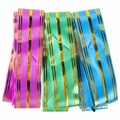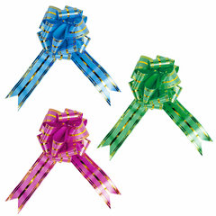Бант-шар ЗОЛОТАЯ СКАЗКА - идеальный вариант для тех, кто считает, что каждый подарок должен быть уникальным и выделяться из массы других своей оригинальностью.Набор состоит из 3-х бантов-шаров в трех цветах с золотыми металлизированными полосами - фуксия, бирюзовый, зеленый. Ширина ленты - 5 см, длина ленты в разобранном виде - 157 см. Банты выполнены из прочного полипропилена (80%) и полиэтилена (20%). Диаметр банта в собранном виде около 15 см.