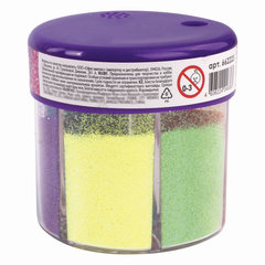 В наборе 6 неоновых цветов по 10 грамм каждого цвета. Удобный диспенсер, сделанный по принципу солонки, позволят использовать только выбранный цвет, не задействовав при этом другие. Компактная упаковка 6,5х6х6 см позволяет хранить все цвета в одном месте.