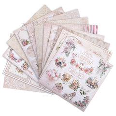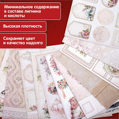 В набор входят 12 листов двусторонней бумаги плотностью 180 г/м2, содержащих 12 вариантов дизайна: 10 фоновых дизайнов и 2 набора с фигурными вырубками для вырезания. Стандартный размер бумаги 30х30 см делает ее удобной для использования в создании скрап-альбомов. Матовая бумага отличается высоким качеством печати.