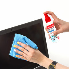 Пропитывающий состав: вода, неионогенные ПАВ менее 5%, консервант, антистатический компонент. Очищаемые поверхности: экраны, стекло и пластик, Объем флакона: 100 мл, Размер салфетки: 25х25 см, Комплектация: салфетка, спрей, Упаковка: блистер с европодвесом. Код: 510341