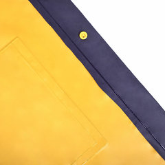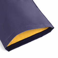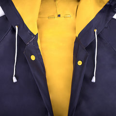 Длина по спинке (от воротника до нижнего края) – 90 см. Полуобхват груди (измеренный на уровне глубины проймы) – 70 см. Длина рукава (от воротника до края) – 80 см. Полуобхват рукава – от 26 см до 19 см. Размеры капюшона (в сложенном виде) – высота 34 см, глубина 27 см. Цвет верха – темно-фиолетовый. Цвет внутренней части – желтый.