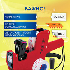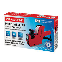 Размер ленты: 21x12 мм, Ширина ролика: 30 мм, Тип ленты: прямоугольная, Количество строк: 1 шт., Количество символов в строке: 8, Тип символов: знаки, цифры, Комплектация: инструкция, красящий ролик, этикет-пистолет, этикетки, Серия: Brauberg, Цвет корпуса: красный, Вес: 0.38 кг.