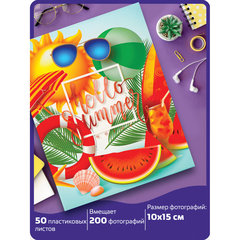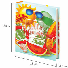 Тип листов: полипропиленовые листы с карманами, Макс. количество фотографий: 200 шт, Размер фотографий: 10х15 см, Тип обложки: твердая, Базовый цвет обложки: разноцветный, Дизайн: Здравствуй, лето, Количество листов: 50 шт., Размер листа: 17,5х22 см, Скрепление страниц: термосварка, Цвет страниц: белый, Высота альбома: 23 см, Ширина альбома: 18 см, Ширина корешка: 5 см, Упаковка: воздушно-пузырчатый пакет.