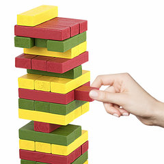 Суть игры проста: из брусков необходимо построить башню, используя по 3 бруска в каждом ряду (можно устанавливать в одном ряду как бруски одного цвета, так и разных цветов). Далее игроки по очереди бросают кубик, определяющий, брусок какого цвета нужно переместить на верх башни. Игроки по очереди вытаскивают по 1 бруску и перемещают их на верх башни так, чтобы она устояла. Игрок, в чей ход башня упадет, проиграл. Выигрывает тот, кто последним поставил брусок, не обрушив башню.