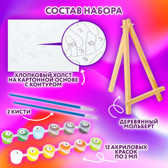 Краски укрывистые, быстро сохнут без потери цвета. Каждый цвет в наборе подходит под конкретный номер, благодаря чему нет необходимости смешивать краски. Однако, если Вы хотите добиться нового оттенка, наши краски с легкостью позволят это сделать, благодаря отличной смешиваемости. 2 синтетические кисти разного размера идеально подойдут для закрашивания элементов различной сложности. Холст из 100% хлопка плотностью 290 г/м2 с высококачественной печатью и отличным натяжением. Небольшой деревянный мольберт можно использовать как в процессе работы, так и в качестве оригинальной подставки для готовой картины. Для лучшего перекрытия контура основы и достижения большей контастности рекомендуем класть краску в 2-3 слоя, после того, как высохнет предыдущий.