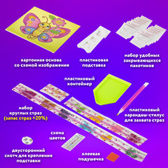 Картина стразами ЮНЛАНДИЯ - это набор для создания уникальной картины своими руками в технике алмазной мозаики - популярного и интересного хобби. Готовая блестящая картина станет отличным подарком или украсит интерьер. Всё необходимое входит в набор.Набор для создания картины стразами "Бабочка" включает в себя: - картонную основу с нанесенной на неё схемой изображений, пронумерованной по цветам; - набор круглых акриловых страз различных цветов, пронумерованных в соответствии со схемой; - удобные закрывающиеся пакетики для хранения страз; - пластиковый карандаш-стилус для захвата страз; - клеевая подушечка; - пластиковый контейнер; - пластиковая подставка; - кусочек двустороннего скотча для крепления подставки к картонной основе; - схема соответствия цветов страз и символов на холсте.