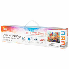 Размер готовой картины составляет 30х40 см. Картина полностью заполняется квадратными акриловыми стразами, благодаря чему готовая работа блистает и переливается на свету.