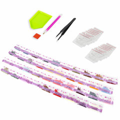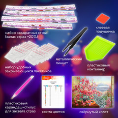 В набор входят: - свернутый холст размером 36х46 см; - набор квадратных страз разных цветов, пронумерованных в соответствии со схемой; - набор удобных закрывающихся пакетиков; - металлический пинцет; - пластиковый карандаш-стилус для захвата страз; - клеевая подушечка; - пластиковый контейнер; - схема соответствия цветов страз и символов на холсте.