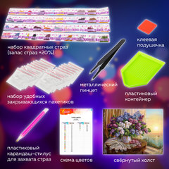 В набор входят: - свернутый холст размером 36х46 см; - набор квадратных страз разных цветов, пронумерованных в соответствии со схемой; - набор удобных закрывающихся пакетиков; - металлический пинцет; - пластиковый карандаш-стилус для захвата страз; - клеевая подушечка; - пластиковый контейнер; - схема соответствия цветов страз и символов на холсте.