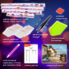 В набор входят: - свернутый холст размером 36х46 см; - набор квадратных страз разных цветов, пронумерованных в соответствии со схемой; - набор удобных закрывающихся пакетиков; - металлический пинцет; - пластиковый карандаш-стилус для захвата страз; - клеевая подушечка; - пластиковый контейнер; - схема соответствия цветов страз и символов на холсте.