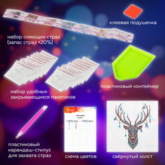 Картина стразами ОСТРОВ СОКРОВИЩ - это набор для создания картины в технике алмазной мозаики. Холст с нанесенным изображением и клеевым слоем заполняется акриловыми стразами. В наборе содержится всё необходимое для создания шедевра своими руками.Картина стразами "Этнический олень" включает в себя: - свёрнутый в рулон холст размером 36х36 см; - набор сияющих страз разных цветов, пронумерованных в соответствии со схемой; - набор удобных закрывающихся пакетиков; - пластиковый карандаш-стилус для захвата страз; - клеевая подушечка; - пластиковый контейнер; - схема соответствия цветов страз и символов на холсте.