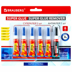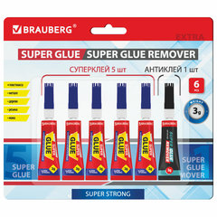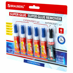 Набор "Клей моментальный Суперклей 5 шт. + "Антиклей 1 шт." BRAUBERG EXTRA незаменим в быту! Применяется для склеивания изделий из пластмассы, дерева, резины, кожи и других материалов.Несмотря на небольшой объем, клей экономно расходуется благодаря высокой плотности. Обладает быстрым схватыванием – всего 5 секунд! Склеивает прочно и надежно. Не растекается, не оставляет видимых следов после высыхания. Водостойкий, термостойкий, устойчив к органическим растворителям. Heпригоден для склеивания посуды, контактирующей с пищей.