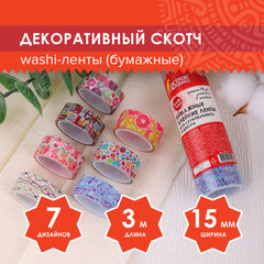 Клейкие WASHI-ленты для декора "Микс №2", 15 мм х 3 м, 7 цветов, рисовая бумага, ОСТРОВ СОКРОВИЩ, 661710