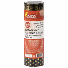 Бумажные клейкие ленты ОСТРОВ СОКРОВИЩ подходят для использования в скрапбукинге, декорирования поделок, открыток, оформления подарков. Декоративные ленты легко приклеиваются и надежно фиксируются на любой поверхности, придавая изделиям оригинальный вид.В наборе содержится 7 бумажных лент черного цвета с различными рисунками из золотистой фольги, каждая из которых намотана на пластиковую втулку. Ширина ленты 15 мм позволяет наклеить её даже на небольшие поделки, а длина 3 м даёт большой простор для творчества.