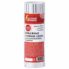 Бумажные клейкие ленты ОСТРОВ СОКРОВИЩ подходят для использования в скрапбукинге, декорирования поделок, открыток, оформления подарков. Декоративные ленты легко приклеиваются и надежно фиксируются на любой поверхности, придавая изделиям оригинальный вид.В наборе содержится 7 бумажных лент белого цвета с различными рисунками из серебристой фольги, каждая из которых намотана на пластиковую втулку. Ширина ленты 15 мм позволяет наклеить её даже на небольшие поделки, а длина 3 м даёт большой простор для творчества.