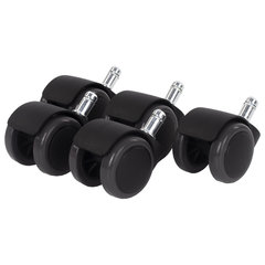 Комплект роликов для офисных кресел. Стандартный размер штока – 11х21 мм. Максимальная нагрузка – 45 кг на 1 колесо. Полиуретановое покрытие обеспечивает бесшумный ход и защищает пол от повреждений. Рекомендованы для ламината, паркета, плитки, линолеума.