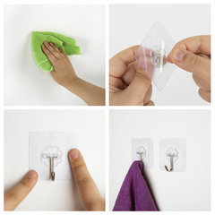 Крючки изготовлены из нержавеющей стали. На обратную сторону прозрачной ПВХ-основы нанесен акриловый клей. Для крепления крючка просто следуйте инструкции, приведенной на упаковке: 1) тщательно обезжирьте и высушите поверхность, на которой предполагается использовать крючок; 2) снимите защитный слой с клеевой поверхности крючка; 3) крепко прижимайте крючок к стене в течение 60 секунд; 4) используйте крючок через 24 часа после приклеивания.
