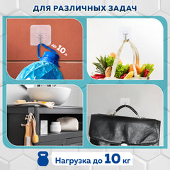 Крючки самоклеящиеся на липкой прозрачной основе уберегут ваши стены от сверления. Подойдут для крепления на гладких, непористых поверхностях. Благодаря стильному современному дизайну впишутся в любой интерьер, помогут организовать удобное хранение вещей.Крючки самоклеящиеся широкого спектра применения подойдут для использования в любом месте вашего дома: в спальне, прихожей, на кухне, в ванной и туалете. Универсальные держатели сделают хранение вещей проще и удобнее. Их можно использовать для того, чтобы вешать: халаты, полотенца, фены, мочалки и другие принадлежности в ванной и душе; фартуки, прихватки, мочалки – на кухне; ключи, сумки и верхнюю одежду – в прихожей; а также как дополнительные крючки в шкафу.