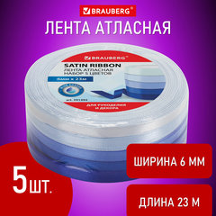 Атласная лента является универсальным текстильным изделием, что обусловлено широкой сферой ее использования. Набор лент атласных BRAUBERG предназначен для оформления подарков, рукоделия, декора, а также используется во флористике для оформления букетов.Изделие представляет собой набор из атласных лент, изготовленных из 100% полиэстера, с ткаными кромками на обоих краях. Кромка на краях лент выполнена с применением полиэстеровой нити. Ленты изготовлены с применением саржевого способа переплетения нитей. В набор входит 5 лент голубых и синих оттенков от светло-голубого до насыщенного синего цвета шириной 6 мм (± 3%) и длиной 23 м. Каждая лента намотана на втулку из пенополистирола. Набор лент упакован в термоусадочную пленку, содержащую этикетку с краткой информацией о товаре.