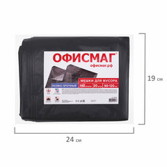 Данный товар относится к ценовой категории выше среднего. Объем: 160 л, Цвет: черный, Прочность: особо прочные, Количество в комплекте: 20 шт., Толщина полиэтилена: 50 мкм, Материал: ПВД, Серия: Офисмаг, Тип дна: прямое, Тип упаковки: пачка, Соответствует требованиям ГОСТа: ГОСТ 12302-2013, Ширина: 90 см, Длина: 120 см. Код: 609343