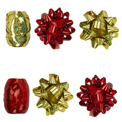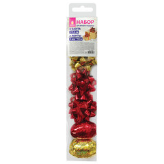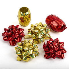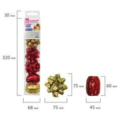 Количество лент в наборе: 2 шт., Ширина ленты: 5 мм, Длина ленты: 10 м, Количество бантов в наборе: 4 шт., Количество цветов в наборе: 2 шт., Диаметр банта: 7.5 см, Самоклеящиеся банты : да, Цвет: красный/золотой, Эффект: голография, Упаковка: пластиковая коробка.