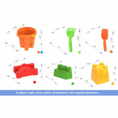 Без возможности выбора цвета. Тип товара: набор для игр в песочнице, Размер: - см, Количество в наборе: 6 шт., Состав набора: 3 формочки, ведро "Замок", грабельки, совок, Тематика: Крепость, Серия: Наборы для игр в песке, Упаковка: сетка. Код: 666444