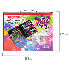 Набор юного художника ПИФАГОР отлично подойдет для первых шагов в рисовании. В красочном кейсе есть все необходимые предметы для развития творческих способностей ребенка.Набор представляет собой кейс с красочным дизайном и грамотно подобранным наполнением из 170 предметов. Кейс раскладывается как книга. Каждый предмет надежно закреплен в ячейке. Надежный корпус кейса гарантирует полную защиту внутреннего наполнения от повреждений. Набор надежно упакован в воздушно-пузырчатую пленку и короб из гофрокартона. Набор удобно брать с собой в школу или в любые поездки.