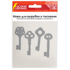 Ножи для вырубки и тиснения ОСТРОВ СОКРОВИЩ - это фигурные стальные ножи, предназначенные для использования с машинкой для вырубки и тиснения ОС-5. С их помощью можно создавать вырубки из различных материалов, а также эмбоссировать полученные изделия.В набор входит 4 стальных ножа в форме фигурных винтажных ключей с максимальным размером 86х86 мм. Ножи многофункциональны: каждый из них позволяет создать вырубку и эффект тиснения. Материалы, подходящие для работы - бумага, картон, алюминиевая фольга для рукоделия, фоамиран и другие.