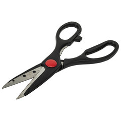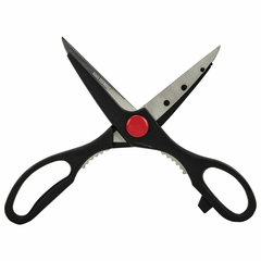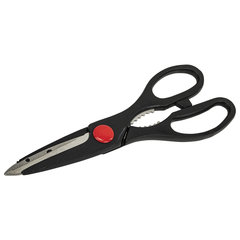 Ножницы отлично подойдут для разделки рыбы и мяса птицы, нарезки овощей, зелени и пиццы. Будут эффективны при резке проводов и кабелей, а также справятся с подрезкой комнатных и садовых растений. Тип : классический, Длина: 210 мм, Количество функций: 2 шт., Функционал: орехокол, Материал ручек: пластик, Цвет ручек: черный, Материал лезвия: сталь, Длина лезвий: 84 мм, Серия: Kitchen, Упаковка: блистер с европодвесом. Код: 608905