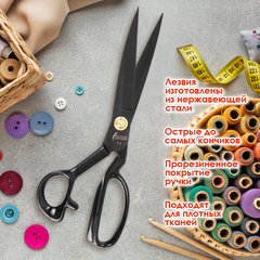 Винт с возможностью регулировки обеспечивает возможность точной настройки в соответствии с индивидуальными потребностями пользователя. Надежные соединения и качественные материалы гарантируют долгий срок службы. Ножницы упакованы в подарочную коробку, удобную для хранения ножниц после покупки. Они станут прекрасным подарком для швей и для тех, кто увлекается рукоделием. Длина: 290 мм, Тип ножниц: портновские, Цвет: черный, Ручки: прорезиненные, эргономичные, Материал ручек: металл с резиновыми вставками, Материал лезвия: металл, Длина лезвий: 150 мм, Упаковка: подарочная коробка. Код: 665599
