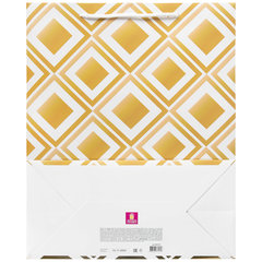 Изготовлен из ламинированного мелованного картона с веревочными ручками из полипропилена. Размер – 26x13x32 см. Пакет выполнен в белом цвете с изображением абстракции в форме ромба. С лицевой стороны пакета некоторые детали покрыты тиснением золотистой фольгой. Формат: вертикальный, Вид пакета: штучный, Дизайн: Gold Luxury, Материал: мелованный картон, Количество в комплекте: 1 шт., С рисунком: да, Цвет: белый, Размер пакета: L (26х13х32) см, Формат размера пакета: L. Код: 608249