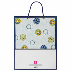 Изготовлен из ламинированной мелованной бумаги с веревочными ручками из полипропилена. Размер – 26x13x32 см. Пакет с принтом в виде кругов и колец выполнен в серых, синих и бежевых тонах. Формат: вертикальный, Вид пакета: штучный, Дизайн: Кольца и круги, Материал: мелованная бумага, Количество в комплекте: 1 шт., С рисунком: да, Цвет: серо-синий, Размер пакета: L (26х13х32) см, Формат размера пакета: L. Код: 606602