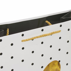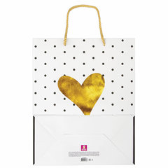 Изготовлен из ламинированной мелованной бумаги с веревочными ручками из полипропилена. Размер – 26x13x32 см. Пакет выполнен в белом цвете с принтом "черный горошек" и изображением сердца золотистого цвета. Формат: вертикальный, Вид пакета: штучный, Дизайн: золотое сердце, Материал: мелованная бумага, Количество в комплекте: 1 шт., С рисунком: да, Цвет: черно-белый, Размер пакета: L (26х13х32) см, Формат размера пакета: L. Код: 606583