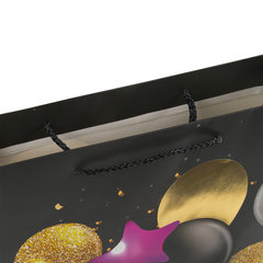 Изготовлен из ламинированного мелованного картона с веревочными ручками из полипропилена. Размер – 33x12,7x44,7 см. Пакет выполнен в чёрном цвете с изображением ярких праздничных воздушных шаров. С лицевой стороны пакета некоторые детали покрыты тиснением золотистой фольгой. Формат: вертикальный, Вид пакета: штучный, Дизайн: воздушные шарики, Материал: мелованный картон, Количество в комплекте: 1 шт., С рисунком: да, Цвет: чёрный, Размер пакета: XL (33x13x45) см, Формат размера пакета: XL. Код: 608240