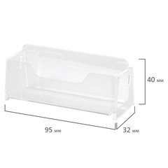 Максимальное количество визиток: 50 шт., Серия: Standard , Ширина визитки: 95 мм, Количество отделений: 1, Материал: оргстекло, Высота: 40 мм, Ширина: 95 мм, Глубина: 32 мм, Цвет: прозрачный, Упаковка: картонная коробка.