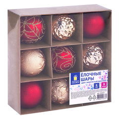 Набор упакован в картонную коробку с крышкой из ПВХ. Количество в наборе: 9 шт., Диаметр: 6 см, Материал: пластик, Цвет: красный/золотой, Отделка: ассорти, Наличие рисунка: да, Серия: Red&Gold. Код: 592451