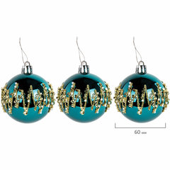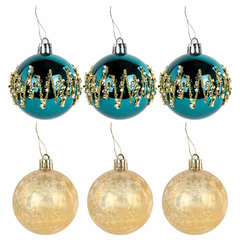 Ёлочные шары ЗОЛОТАЯ СКАЗКА - непременный атрибут Нового года. Они будут отлично смотреться как на зеленой, так и на белой хвое ели. Насыщенные цвета в сочетании с отделкой разной фактуры создадут атмосферу праздника и волшебства.В наборе: 3 шара золотистого цвета диаметром 6 см с объемным узором с матовым эффектом, 3 шара бирюзового цвета диаметром 6 см с золотистым рисунком с глянцевым эффектом, а также 6 нитей из полиэстера золотистого цвета длиной 30 см для подвешивания шаров.