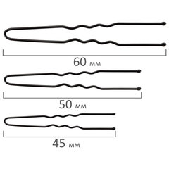 Материал – металл. Цвет – чёрный. Покрытие – глянцевое. Тип товара: шпильки для волос, Цвет: черный, Тип покрытия: глянцевый, Тип заколки: шпилька, Декор: нет, Набор: да, Количество в наборе: 60 шт., Размер: 4,5 / 5 / 6 см, Материал: металл, Серия: -, Упаковка: блистер с европодвесом. Код: 457104