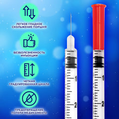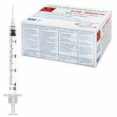 Шприц инсулиновый с интегрированной иглой состоит из трех компонентов: цилиндр, поршень и манжета. Имеет градуировку по шкале U-40, объем - 1 мл, размер иглы 30G.Безболезненность инъекции обуславливается легким скольжением поршня, без трения. Удерживающее кольцо на поршне предотвращает потерю медикамента. Градуировка на шприце выполнена в единицах инсулина и позволяет легко считывать показания.