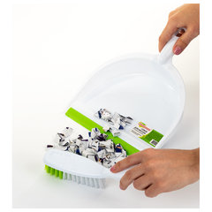 Материал инвентаря: пластик, Длина ручек: 14 см, Ширина совка: 21.5 см, Глубина совка: 27.6 см, Резиновая кромка у совка: да, Высота щетины: 4.5 см, Щетка крепится к совку: да, Отверстие для крючка: да, Цвет инвентаря: белый-зеленый.