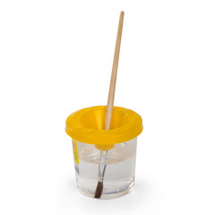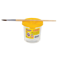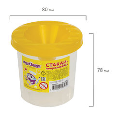 Количество отделений: 1, Полный объем одного отделения: 210 мл, Объем до уровня одного отделения: 75 мл, Углубления на крышке для размещения кисточек: да, Конструкция стакана не позволяет жидкости разливаться: да, Цвет корпуса: прозрачный, Цвет крышки: желтый, Материал: полипропилен.
