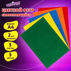 Цветной фетр МЯГКИЙ А4, 2 мм, 5 листов, 5 цветов, плотность 170 г/м2, самоклеящийся, ЮНЛАНДИЯ, 662051