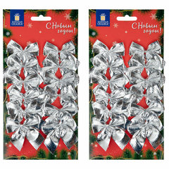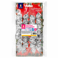 В наборе 24 бантика серебристого цвета. Размер украшений - 5x5 см. Материал - полиэстер. Упакованы в пакет с европодвесом.