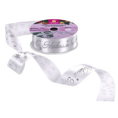 Лента новогодняя декоративная ЗОЛОТАЯ СКАЗКА предназначена для упаковки и декорирования подарков, для оформления праздничных композиций, кондитерских наборов, украшения интерьера.Лента шириной 25 мм и длиной 5 м изготовлена из прочного полиэстера (100%). Плотность ленты – 0,11 г/м2. Цвет – белый, на лицевой стороне имеется серебристое тиснение.