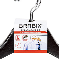 Вешалки-плечики BRABIX с перекладиной для одежды и антискользящими плечиками с рифленой силиконовой поверхностью, которая исключает сползание одежды. Выполнены из качественной древесины благородного темного окраса. Стильные и очень удобные.Вешалки изготовлены из натурального дерева. Лакированные, с невыкручивающимся крючком. Предназначены для бережного хранения одежды. Долговечные и прочные, не прогибаются под тяжелой верхней одеждой. Эстетичны, отлично вписываются в общий интерьер гардеробной. Размер модели составляет 45 см. 3 штуки в комплекте.