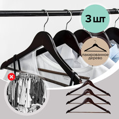 Материал каркаса: дерево, Размер модели: 48-50, Ширина: 45 см, С перекладиной: да, Серия: Стандарт, Особенности: невыкручивающийся крючок, Покрытие: лакированное, Количество в комплекте: 3 шт., Цвет каркаса: шоколадный.